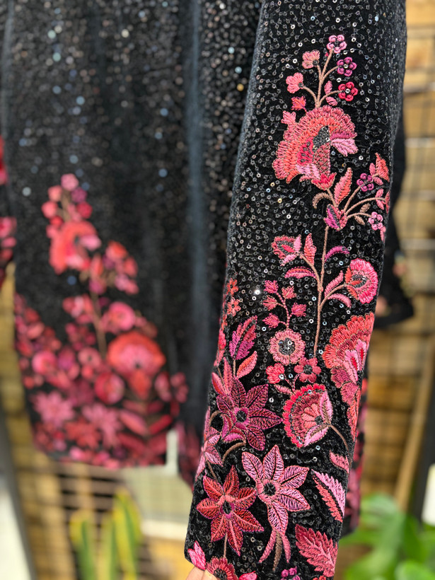 مانتو کتی با پارچه پنل پولک حاشیه سرخابی با قزن دوخت مزونی اعلا در دو سایز ۱/۲مناسب سایز ۳۸تا۴۸ تک رنگ مشکی سرخابی قد:۸۰