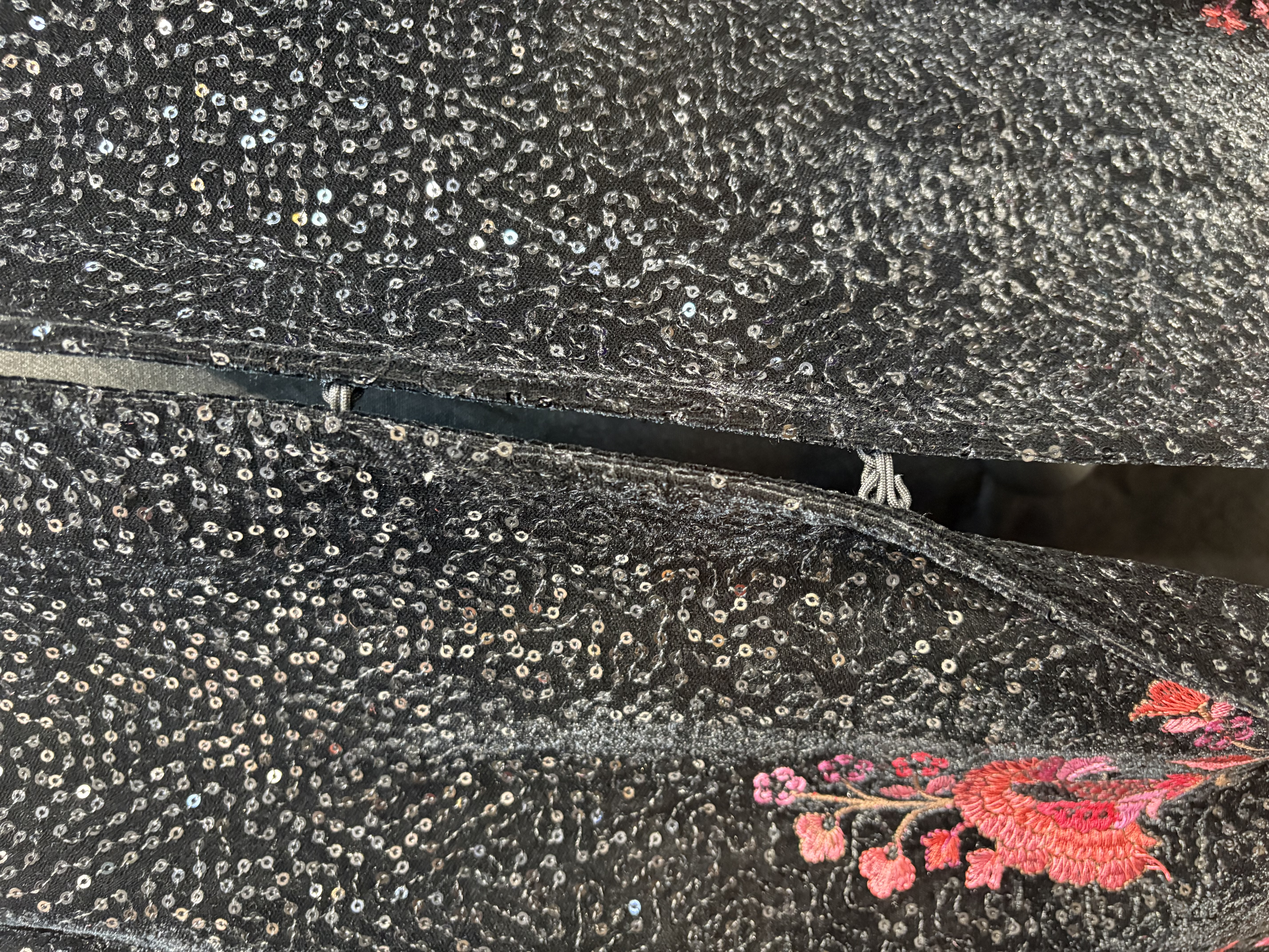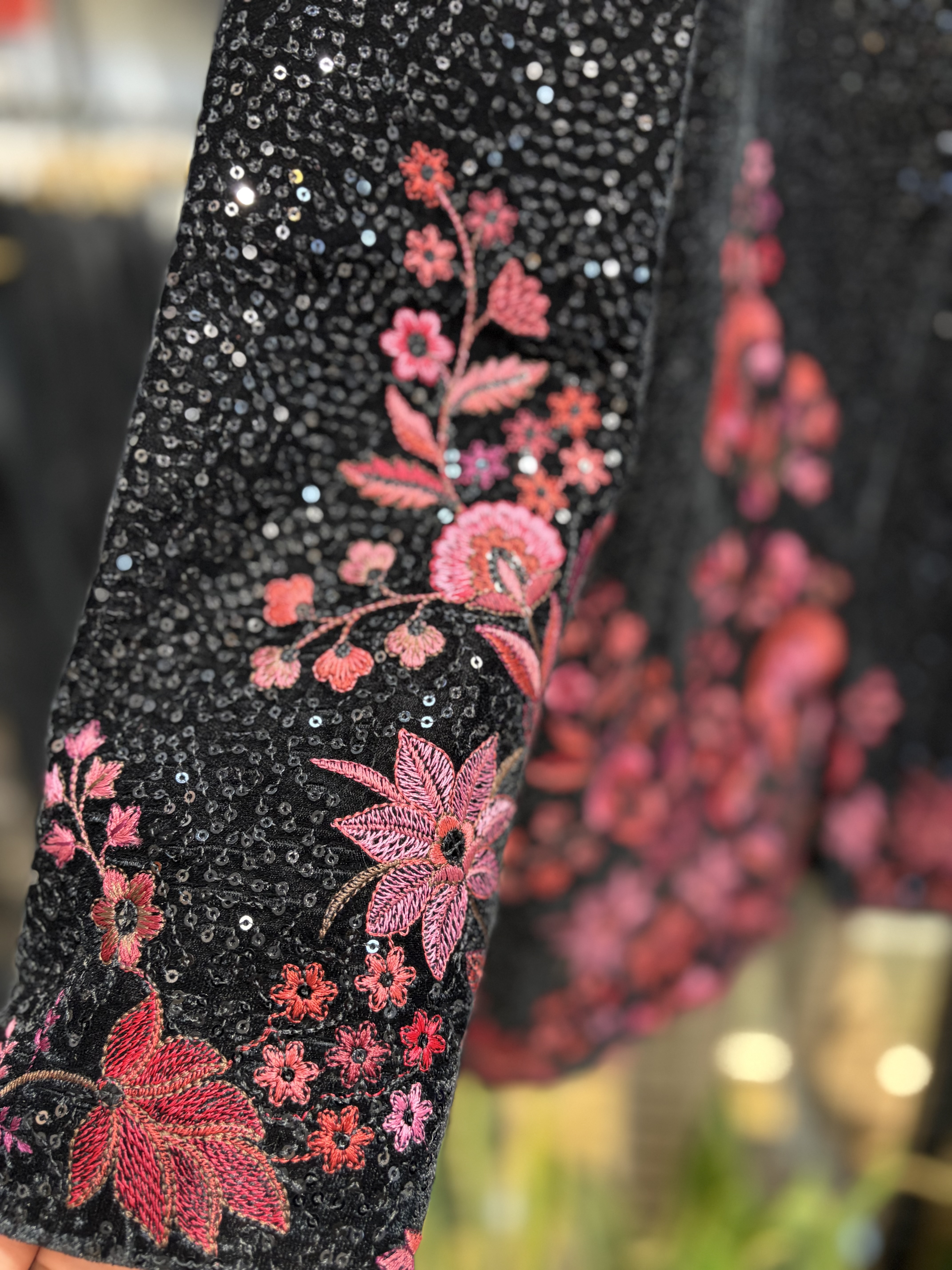 مانتو کتی با پارچه پنل پولک حاشیه سرخابی با قزن دوخت مزونی اعلا در دو سایز ۱/۲مناسب سایز ۳۸تا۴۸ تک رنگ مشکی سرخابی قد:۸۰